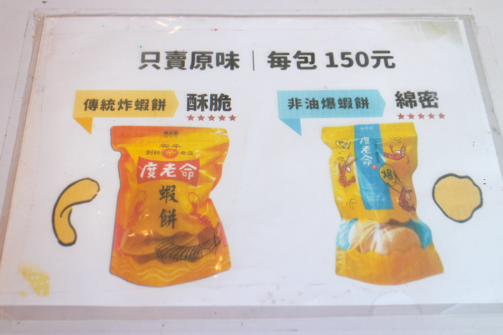 安平度老命蝦餅菜單如下所示,照片是2025年10月拍的。店裡只有原味的蝦餅,有分成「傳統炸蝦餅」及「非油炸爆蝦餅」兩種調理蝦餅的方式可選擇。喜歡酥脆鮮明口感,以及香氣明顯的,可以選擇傳統炸蝦餅。喜歡口味清爽一點,油感不這麼重的,可以選擇非油炸爆蝦餅。