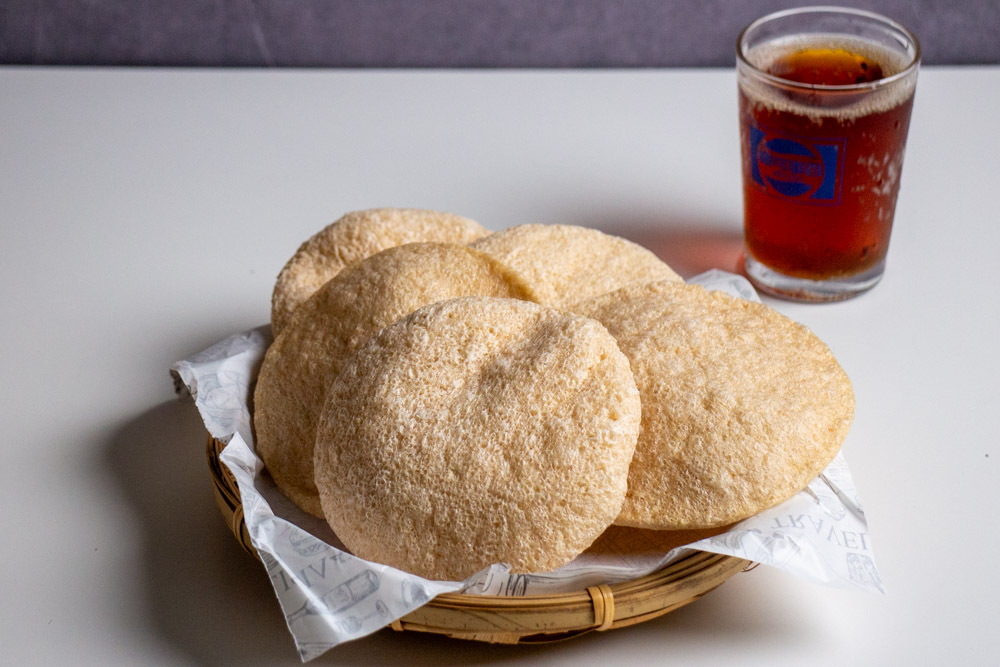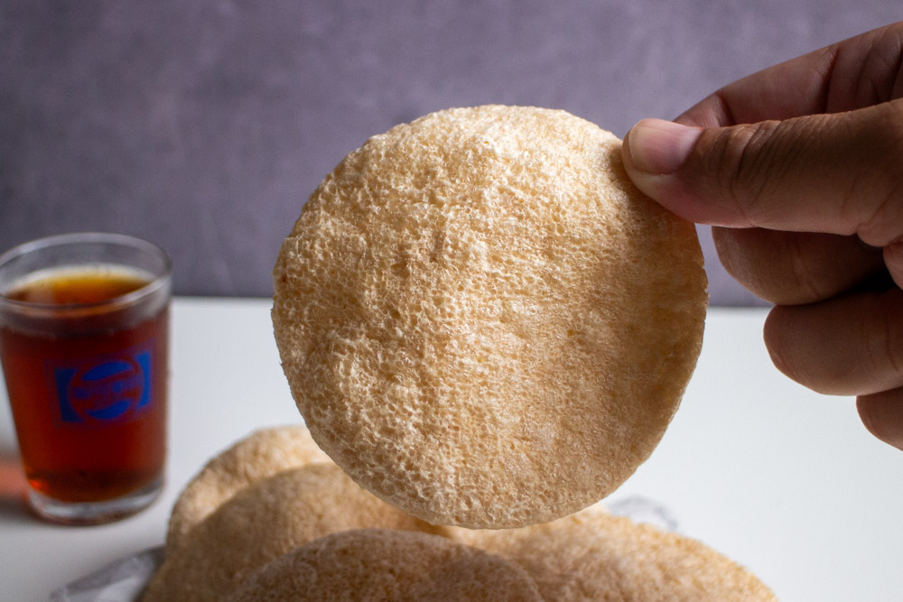 非油炸爆蝦餅是呈圓片狀,打開時有蝦子的香味感緩緩飄散。這天搭配的是氣泡飲吃,一整個很合拍。