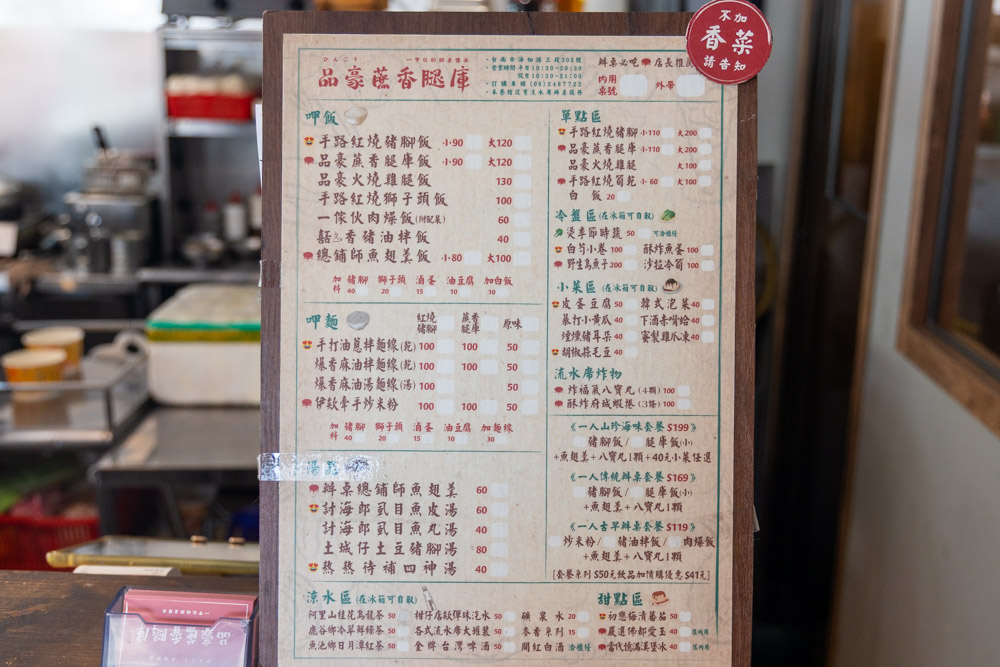 品豪蔗香豬腳菜單如下所示,照片是2025年6月拍的。飯食、麵食、湯品、小菜都有提供。若是不加香菜的話,記得告知店員齁。