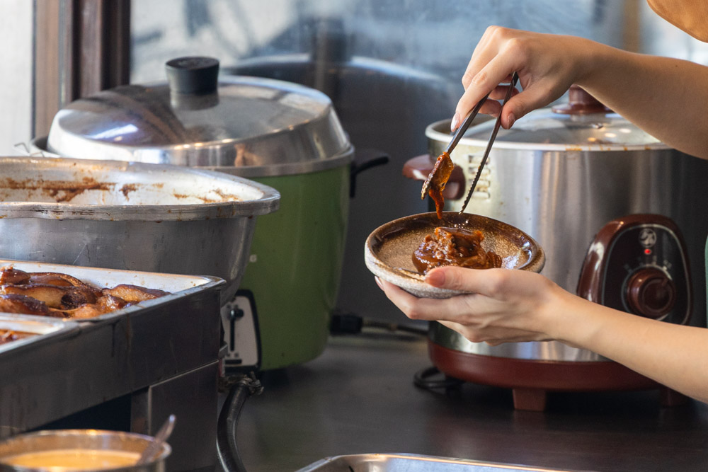 品豪蔗香豬腳店裡有提供不少內用座位。可以拿上菜單,進到店裡找位置入座。入店前,看作業區的豬腳在那邊滷著。陣陣的蒸氣夾帶出誘人的鹹香。還有那ㄉㄨㄞ~ㄉㄨㄞ~的豬腳,散發個迷人的光澤。快點進店找座位點餐囉。