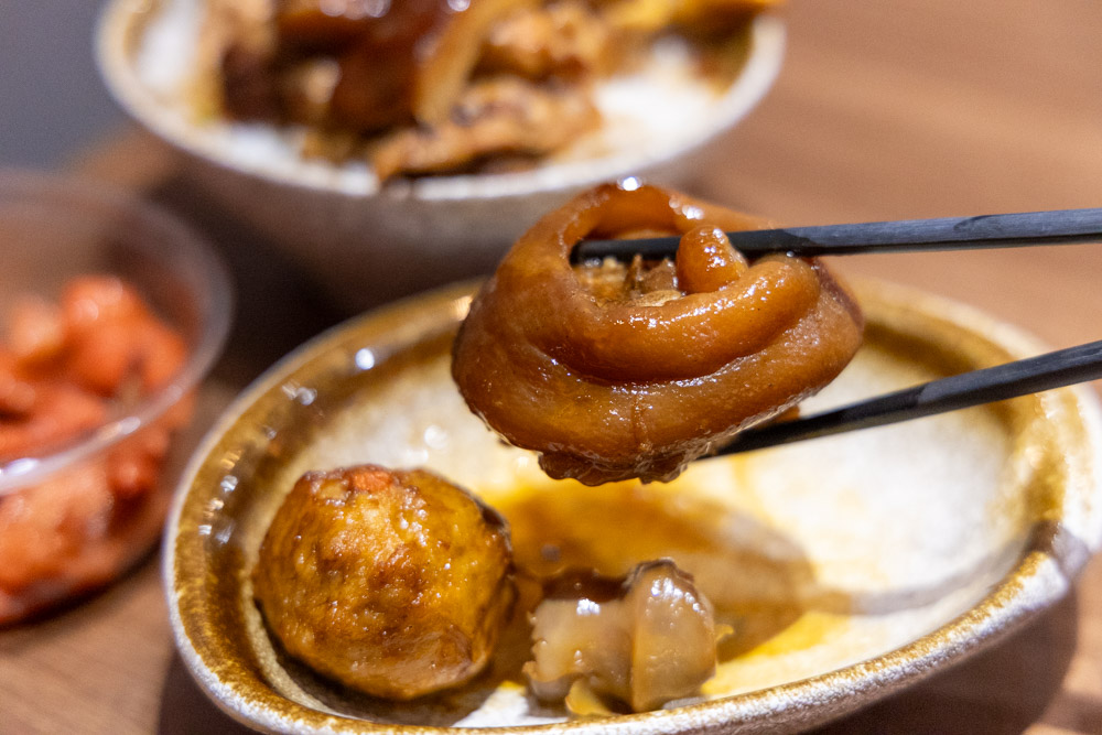 這間品豪蔗香豬腳是團友推薦的豬腳口袋名單,下午沒有午休,對於離峰時段要用餐的朋友而言,是不錯的選擇。這天走訪的餐點中,腿庫皮Q中帶軟,肉有纖維感但不會太柴,滷汁的滋味也入味涮嘴,伴著飯超開胃。豬腳的話,偏皮筋口感居多,滷得入味涮嘴。另外一旁搭配的筍乾,酸味剛好,帶有一些甜甜的滋味,整體調味恰到好處,下次再訪會想額外單點一盤。