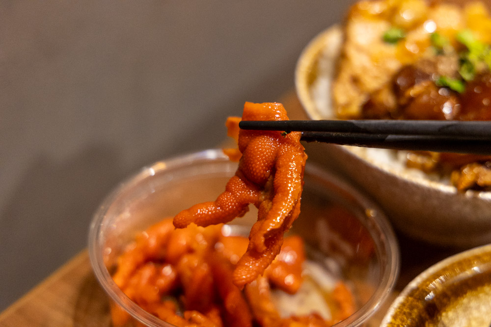 蜜製雞爪凍除去了骨頭,剩下一些軟骨。雞爪調味甜甜的,帶點微微辣度,口感脆彈吃起來涮嘴。