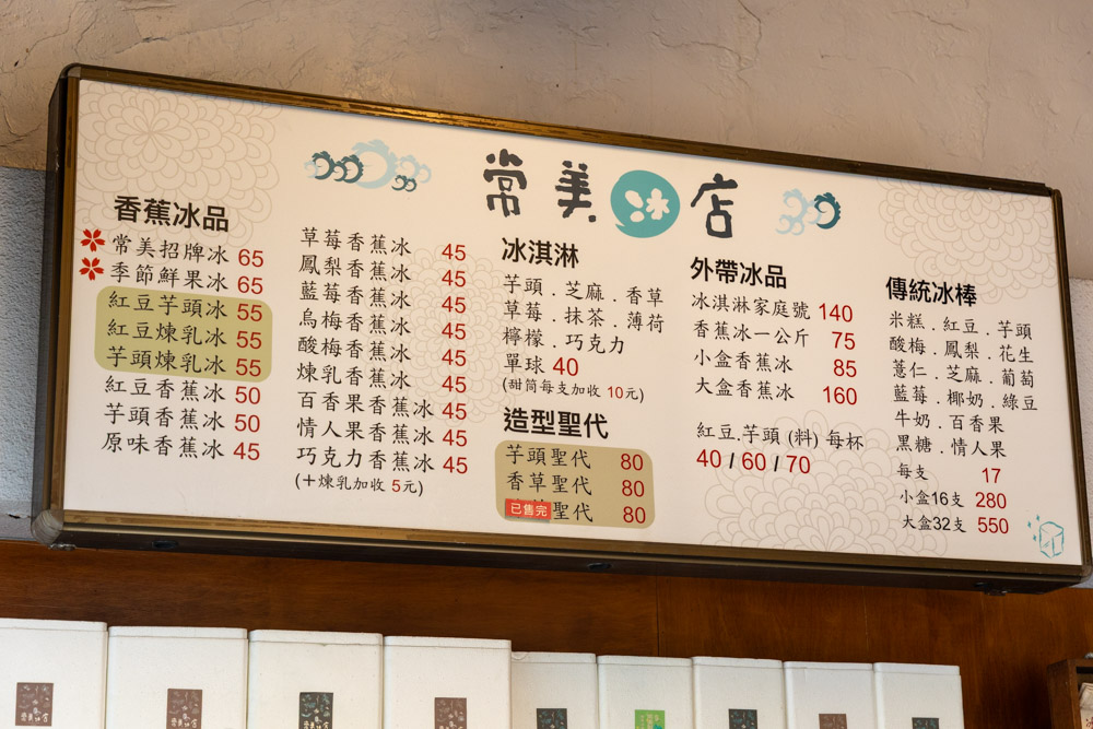 常美冰店菜單如下所示,照片是2025年5月拍的。店裡有『香蕉冰品』、『冰淇淋』、『聖代』、『傳統冰棒』四個系列為主。