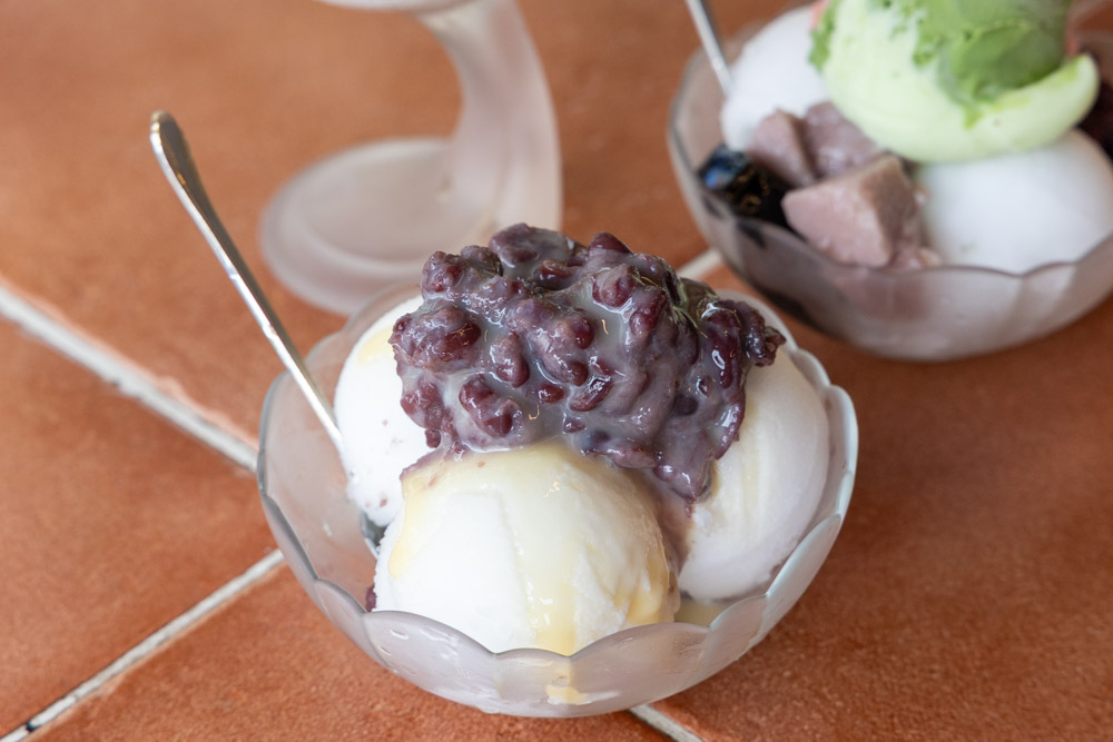 下面白色的香蕉冰,吃起來透著細細柔柔香蕉香氣還有甜味,伴著一旁的紅豆、芋頭、或是仙草,增添一些不同食材的香氣口感交錯。再搭配上綜合冰淇淋,又多了些冰淇淋的香甜感。招牌的就還蠻喜歡的了說。