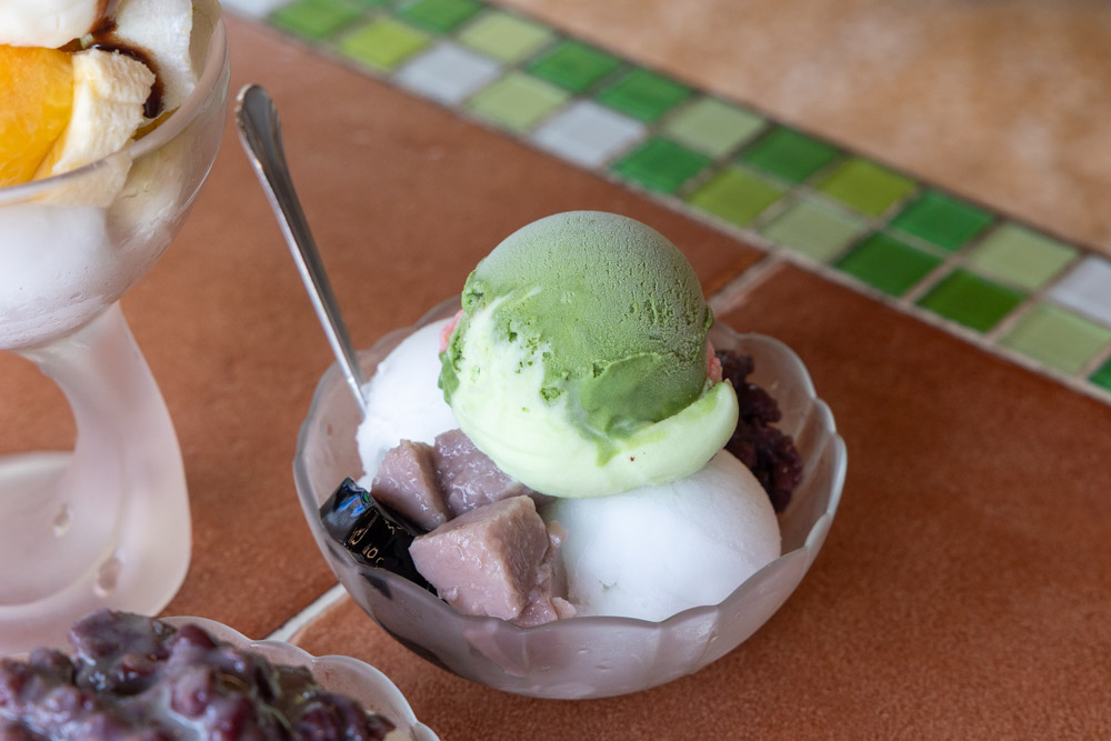 五十咩點的是常美招牌冰。底下有香蕉冰,灑上一些冰品配料後,在上面放上一球綜合冰淇淋。綜合冰淇淋是隨機的口味,像這天五十咩吃到的是薄荷、抹茶、草莓三種。