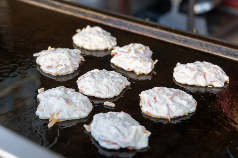 木瓜粄老闆娘有介紹說,他們選用六分熟的木瓜,切絲後拌入在來米粉與麵粉調製的麵糊。