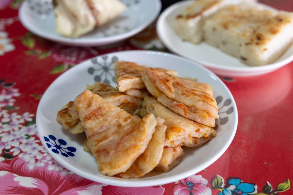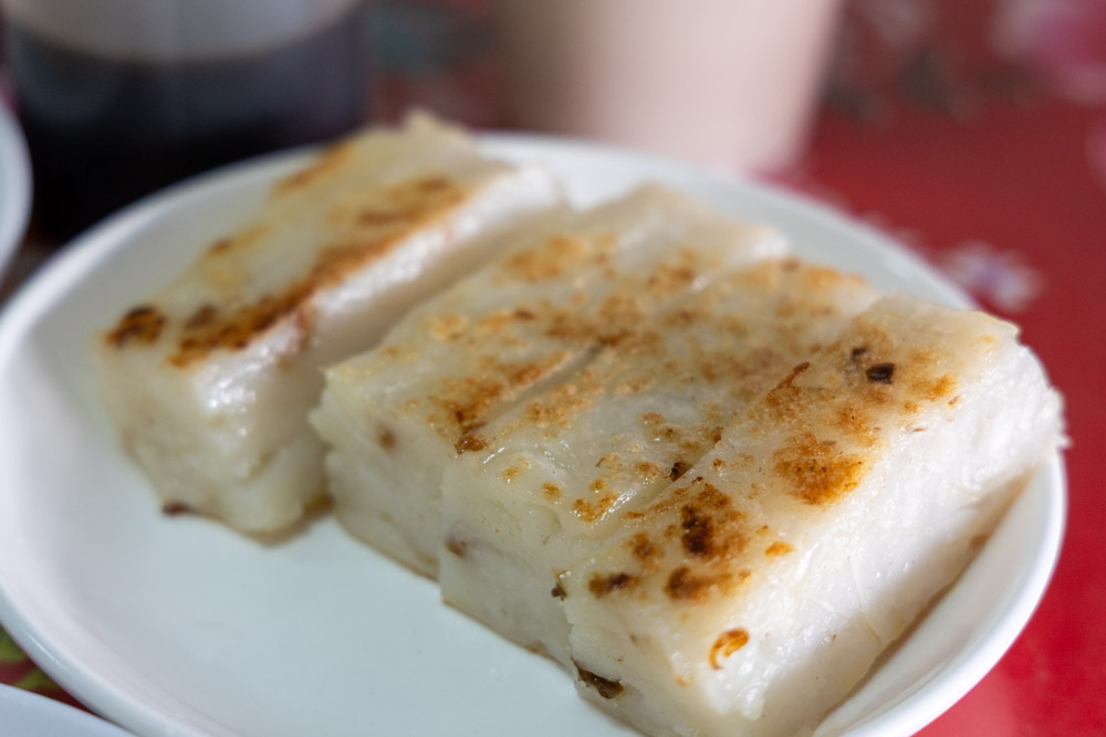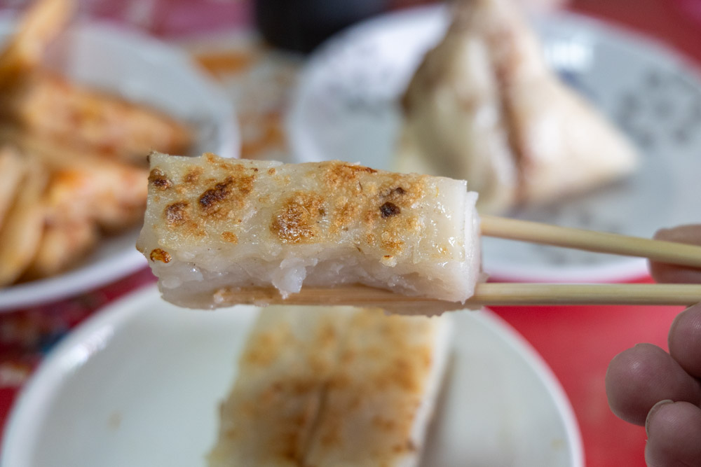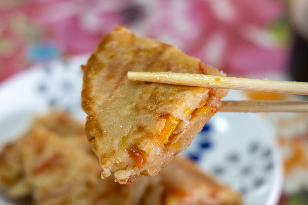 蘿蔔粄的口感跟木瓜粄有明顯的差異。吃起來多了點濕潤感,交錯著蘿蔔絲以及蘿蔔香氣,透著柔柔甜味。