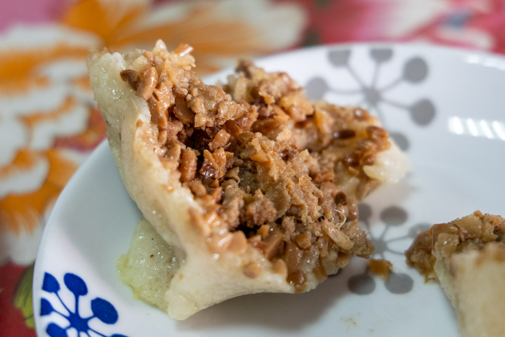 雖然是店家忙碌中誤上的小插曲,卻意外品嚐到不同的風味。內餡與常見的粽子不同,加入了肉燥、花生碎粒與蝦米。每一口都能感受到花生的顆粒感,陣陣花生香隨之散發,風味獨特順口。