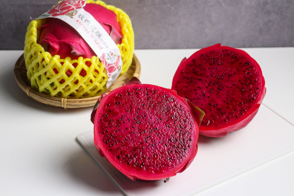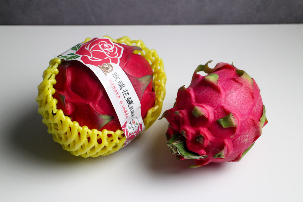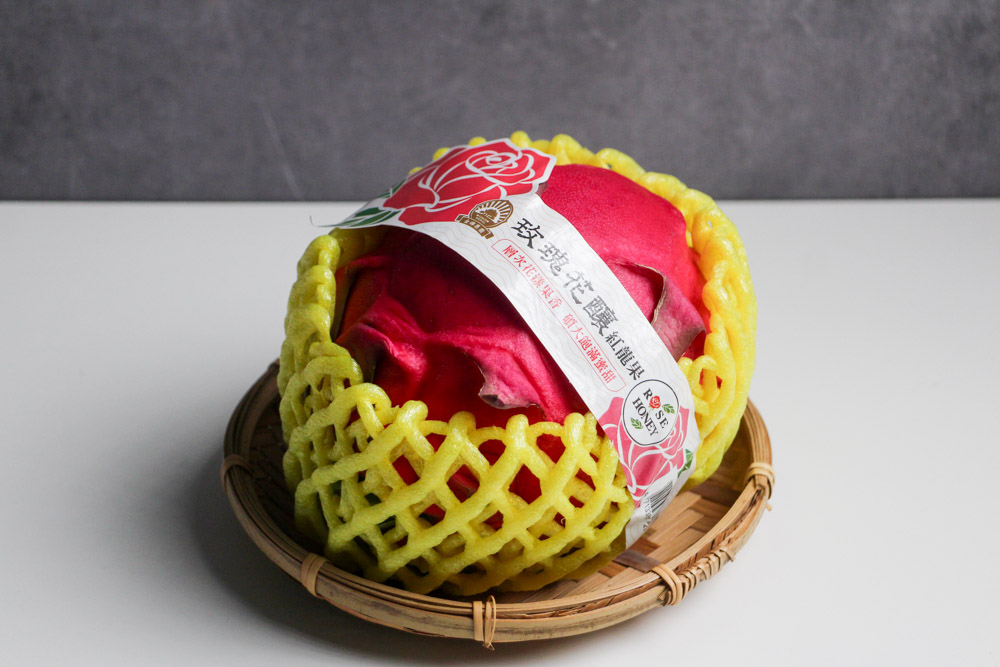 近一年逛全聯時,偶而可以看到有些全聯分店會進一些特別的紅龍果。外觀看起來相對大顆,大約600公克左右。一顆大概在90元到120元不等。這款紅龍果通常是單顆販售,外面會有防撞的保護袋,還會綁上一圈畫有玫瑰圖樣的標示,並且上面寫著【玫瑰花釀紅龍果】。